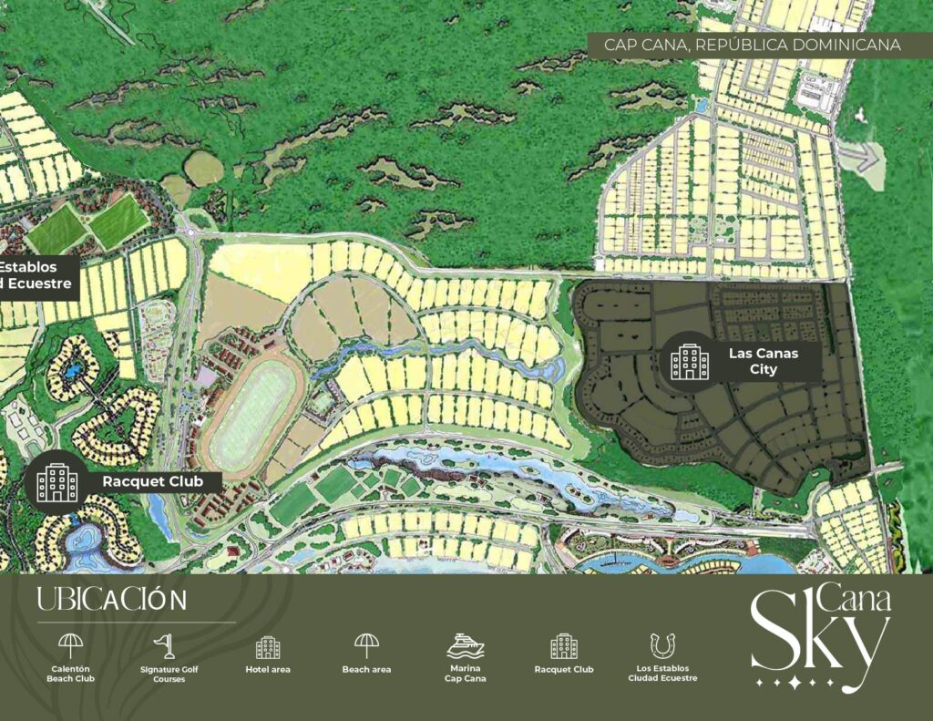 Se encuentra ubicado a solo 8 minutos del aeropuerto internacional de Punta Cana y Justo al Lado de Cap Cana el destino turístico por excelencia, disfrutando de un sin números de atractivos y exclusividad en toda el áreas acompañadas de hermosas playas de arena blanca y campo de golf Punta Espada.